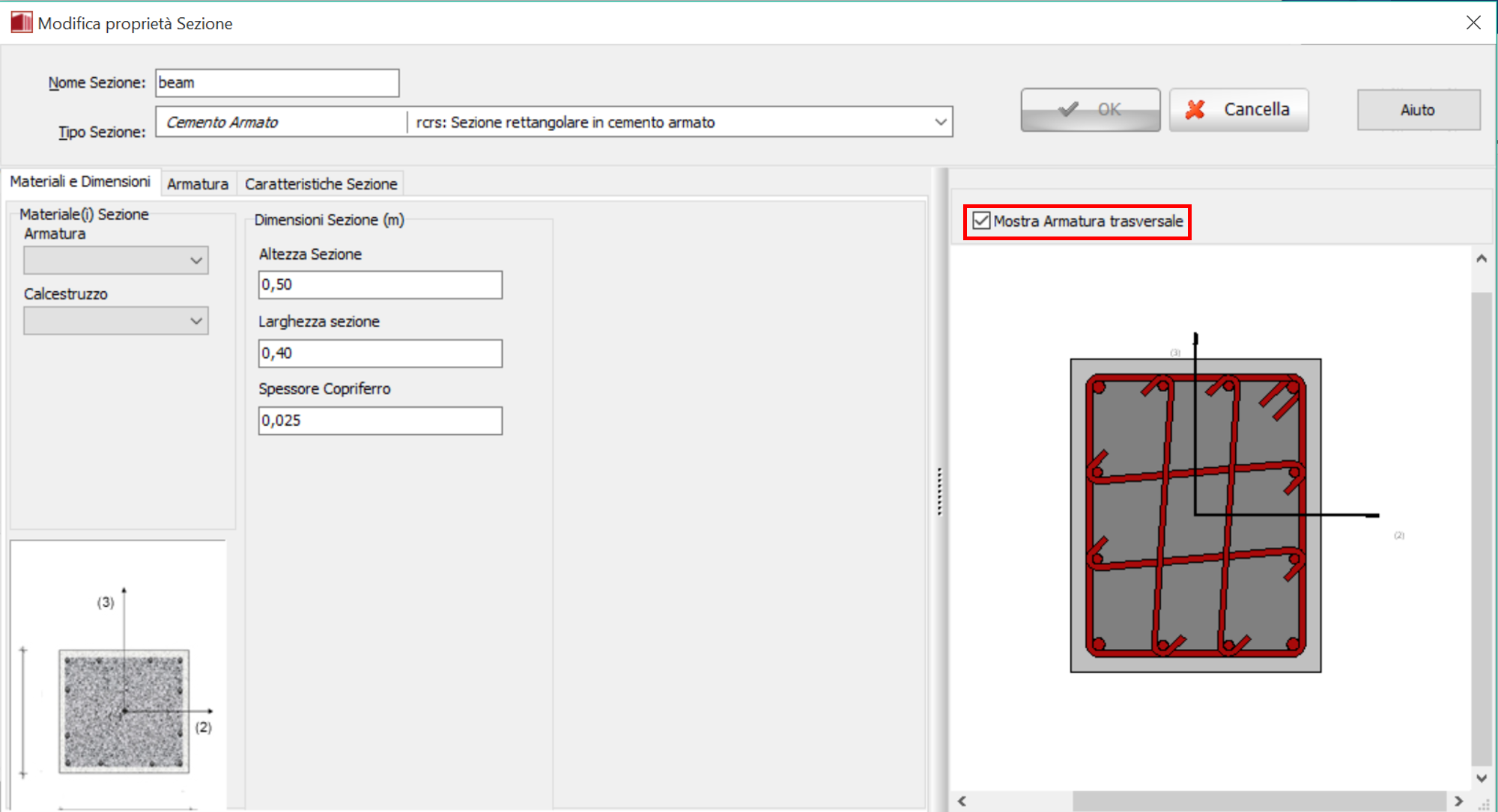 Per le sezioni semplici in cemento armato devono essere specificati due materiali, uno per il calcestruzzo e uno per l'armatura. Per le sezioni rinforzate (Incamiciate) invece occorrono 4 materiali, per il calcestruzzo e l’armatura della sezione esistente e per il calcestruzzo e l’armatura del rinforzo. Alle diverse aree di calcestruzzo possono essere assegnati diversi fattori di confinamento. Si precisa che la parte esistente/interna della sezione può essere sfalsata (offset), in modo da realizzare rapidamente il copriferro e l’Incamiciatura (nel caso di sezioni rinforzate), invece di aggiungere manualmente queste aree.