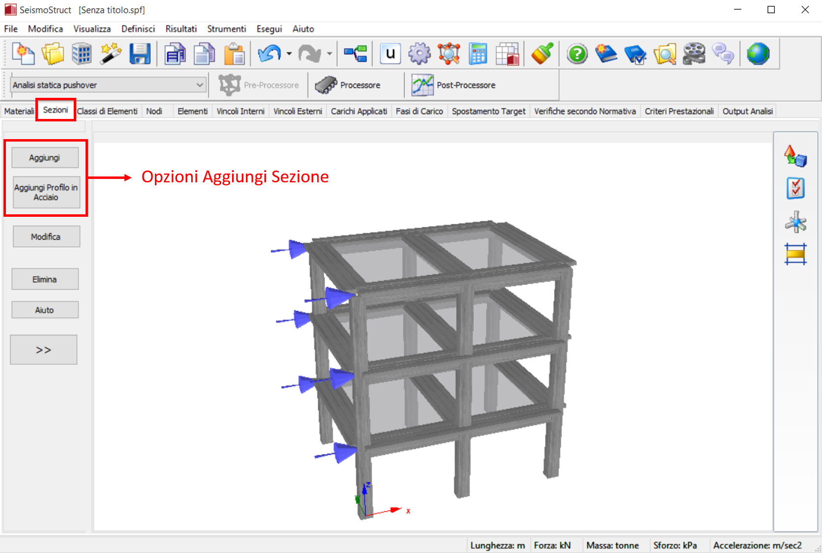 Le sezioni che devono essere disponibili in un progetto di SeismoStruct vengono definite all'interno del modulo Sezioni, in cui, per ciascuna sezione, deve essere esplicitamente indicato: (i) un nome (usato per identificare la sezione nel progetto), (ii) una tipologia (la lista è stata presentata sopra), (iii) uno o più materiali (come definiti nel modulo Materiali), (iv) le dimensioni (lunghezza, larghezza, ecc.) e (v) l'armatura (se supportata).