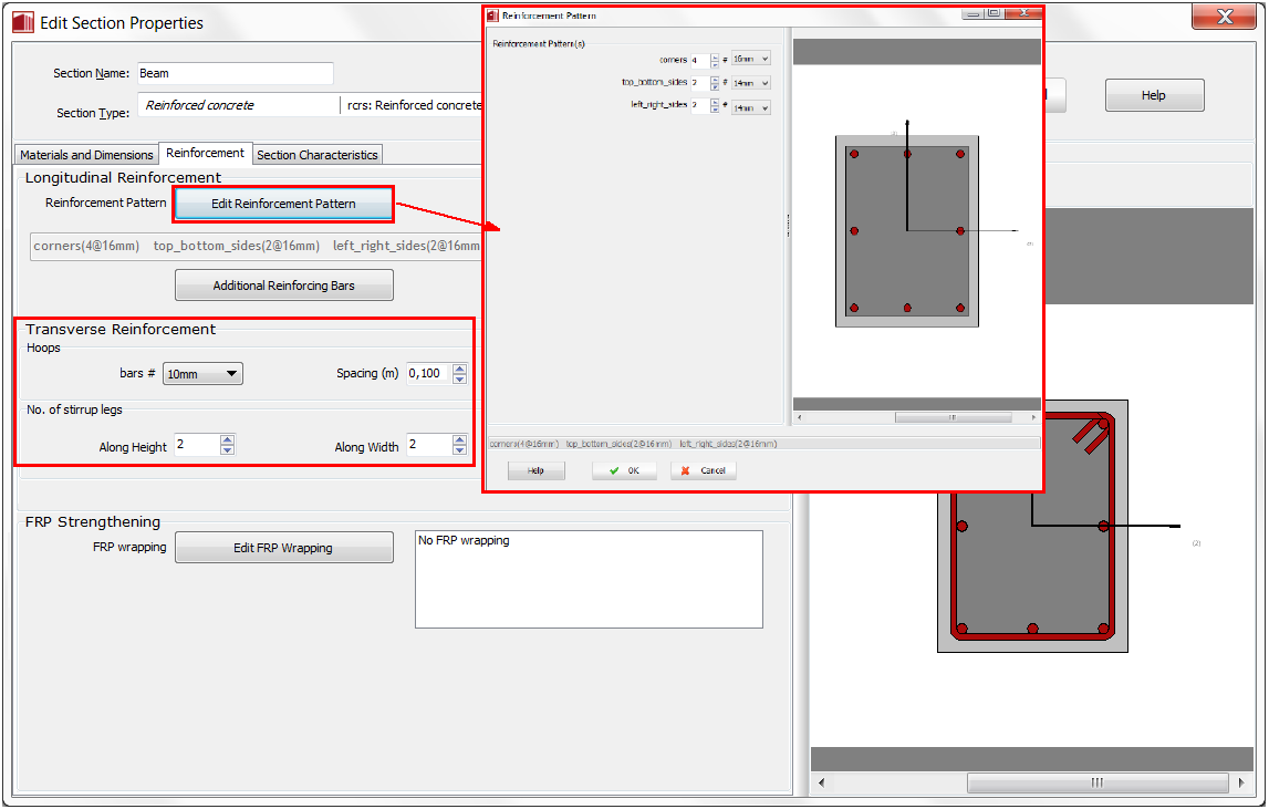 A partire da SeismoStruct v7.0 in avanti è permesso l'inserimento dell'armatura trasversale nelle sezioni in c.a. Questo permette il calcolo automatico dei fattori di confinamento delle sezioni, così come la resistenza a taglio.