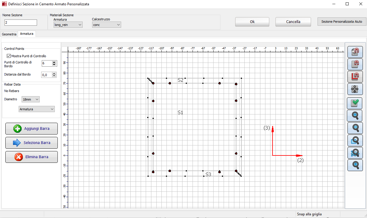 L'armatura della sezione è specificata nella scheda corrispondente con l'ausilio di diversi punti di controllo all'interno o nel perimetro delle aree introdotte. Anche in questo caso l'inserimento avviene graficamente cliccando sui punti di controllo.