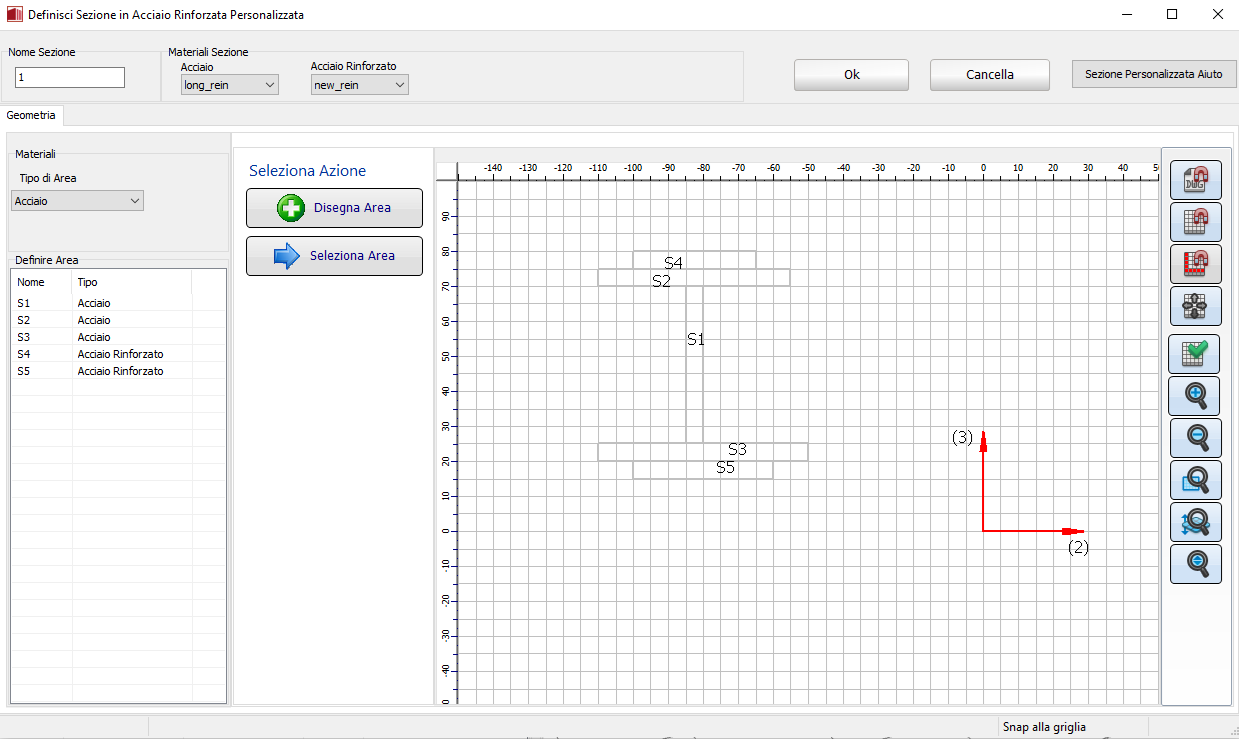 Gli utenti possono definire fino a 9 aree di sezione. Le aree vengono definite graficamente dal loro perimetro cliccando sul pulsante Disegna Area. Le aree definite possono essere selezionate e poi cancellate con i pulsanti corrispondenti. Le funzioni e i comandi sul lato destro dello schermo (snap alle aree esistenti, snap alla griglia, orto, pan, zoom avanti, zoom indietro, zoom alla finestra e zoom totale) possono facilitare ulteriormente l'input grafico.