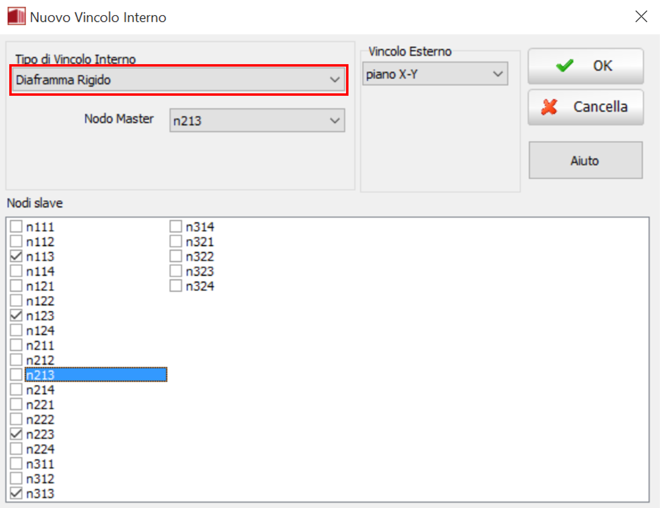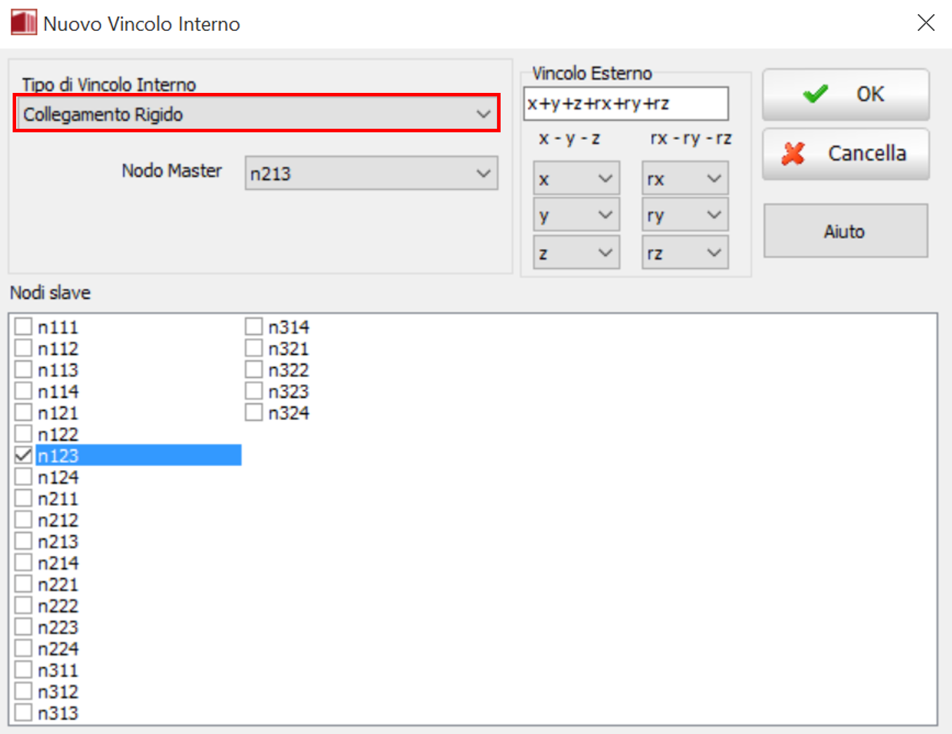 Le diverse condizioni di vincolo interno della struttura sono definite nel modulo Vincoli Interni, dove deve essere specificato il tipo di vincolo, il nodo master associato, i gradi di libertà vincolati e i nodi slave. Come in tutti gli altri moduli, l'utente può aggiungere nuove condizioni (anche in modalità input grafico) ed eliminare/modificare condizioni di vincolo esistenti (si veda il capitolo Strumenti di Modifica). In aggiunta è disponibile anche lo strumento Duplica.