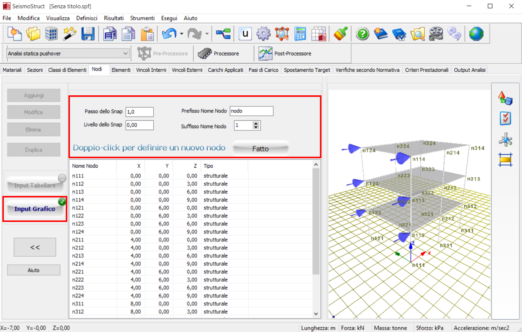 L'utente può aggiungere nuovi nodi anche tramite il pulsante di Input Grafico. In primo luogo è necessario selezionare il passo e il livello dello snap (i valori di default sono, rispettivamente, 1 e 0), poi si deve fare doppio-click sulla griglia per definire il nodo, come illustrato nella figura sottostante.