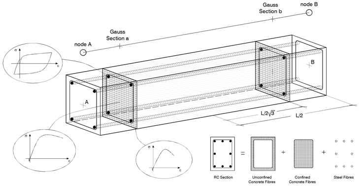 Questo tipo di modellazione presenta, inoltre, numerosi vantaggi che possono essere riassunti nel seguito: (i) nessun obbligo di svolgere, per gli elementi, un'analisi propedeutica momento-curvatura, (ii) nessun bisogno di introdurre alcun tipo di comportamento isteretico associato agli elementi (dal momento che tale comportamento è implicitamente definito dai legami costitutivi dei materiali associati alla sezione), (iii) modellazione diretta dell'interazione carico assiale-momento (sia in termini di resistenza che di rigidezza), (iv) rappresentazione diretta del carico biassiale, e infine (v) interazione tra le resistenze flessionali nelle direzioni ortogonali.