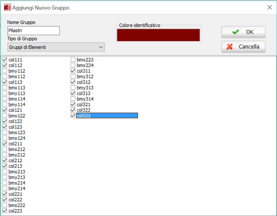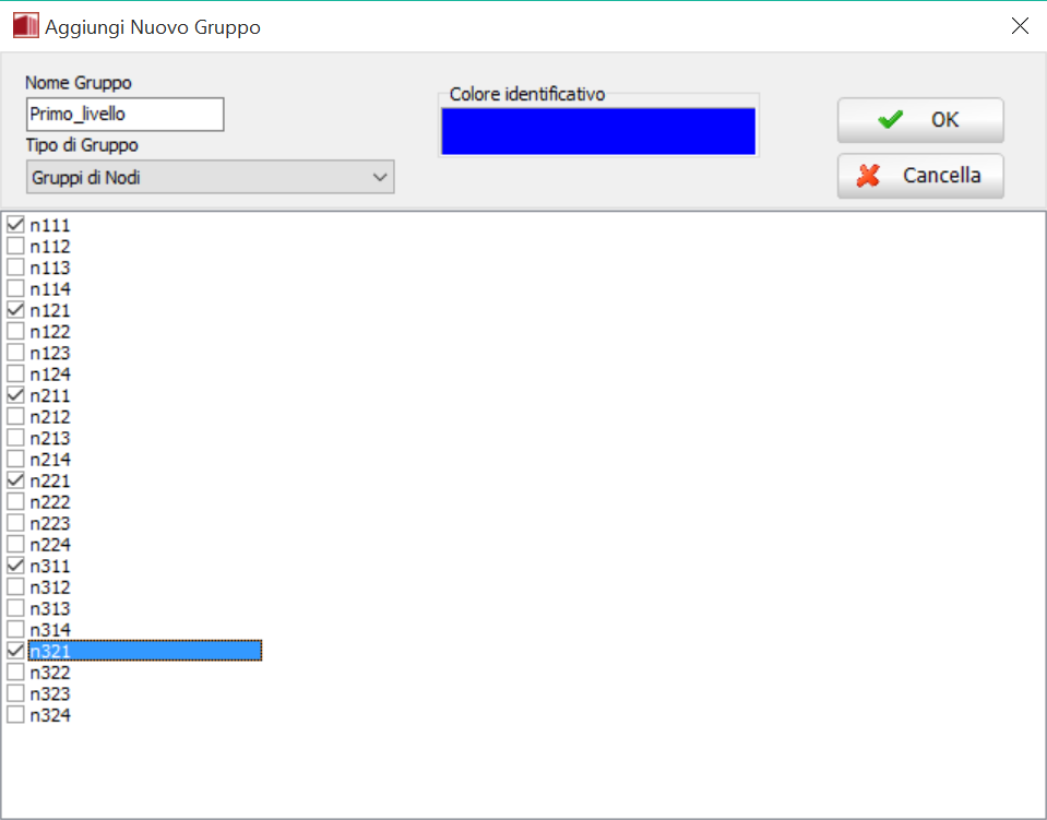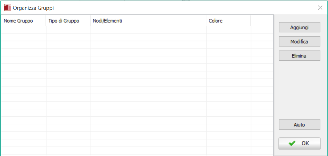 Gli utenti possono aggiungere, modificare e cancellare gruppi di nodi e di elementi usando la funzione Organizza Gruppi, dove è mostrata una lista di tutti i nodi e gli elementi usati nel modello strutturale corrente.