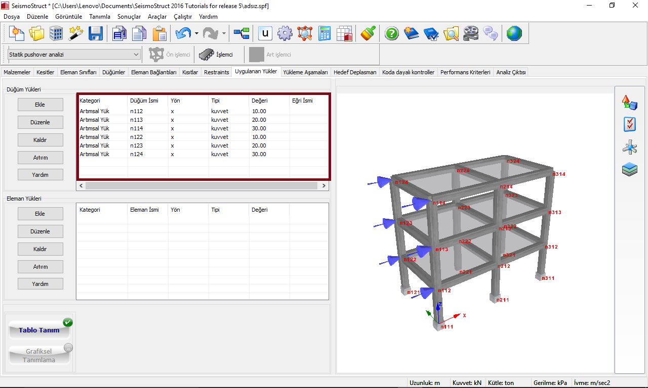 - Kullanıcılar, simetrik olmayan yapıların yatay kapasiteleri değerlendirilirken; yapının kapasitesini hem "zayıf", hem "güçlü" yönlerde tanımlayabilmek için her iki yönde de artımsal yüklerin uygulanmasına dikkat etmelidirler (yani iki itme analizi çalıştırılmalıdır).