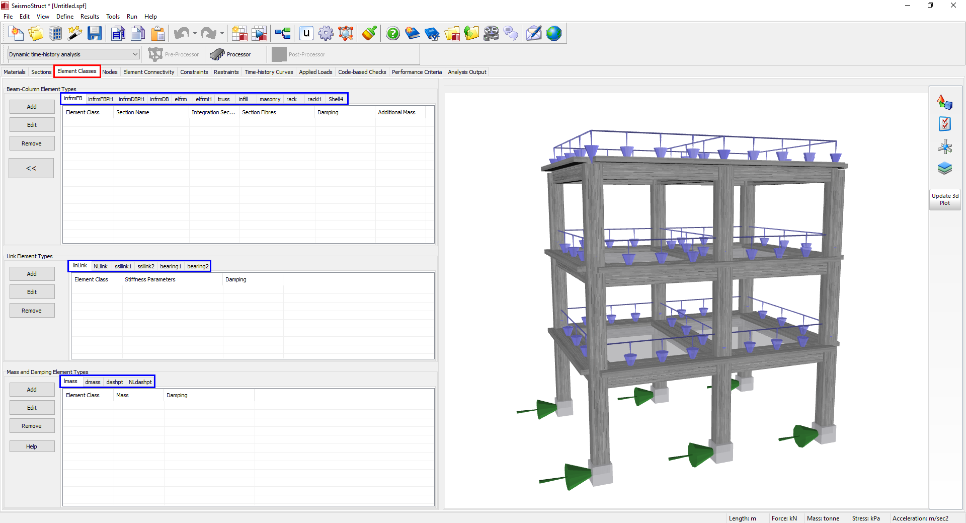 An itibariyle, SeismoStruct içerisinde on değişik eleman tipi mevcuttur. Bu değişik eleman tiplerinin kullanımıyla, yapısal (kolonlar, kirişler, duvarlar, kolon-kiriş birleşimleri, vb.) ve yapısal olmayan elemanların (dolgu duvarlar, enerji sönümleyiciler, atalet kütleleri, vb) doğru modellenmesinin yanı sıra değişik sınır durumları (esnek temeller, sismik izolasyon, yapısal açılma/vurma, vb) da dikkate alınabilir.