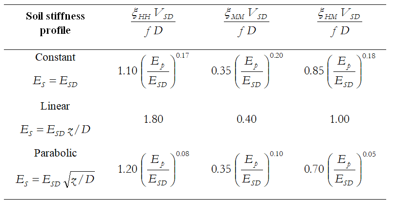 Gazetas [1991] ayrıca, aşağıdaki Tablo'daki ifadelere göre her bir frekans f için hesaplanan karşılık gelen kazık-kafası sönümleme katsayılarını da sunmaktadır.