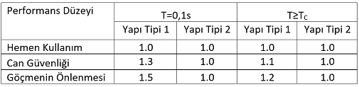 Not: Tip1 yapısal sistemler gevrek sistemlerdir (1985 öncesi yapılan yapılar, deplasman sünekliği 2'den küçüktür), Tip 2 sistemlere göre daha kötü bir tekrarlı ilişkiye sahiplerdir. Tip 2 sistemler, deplasman sünekliği 2'den büyük olan sünek sistemlerdir ve 1985 sonrası tasarıma sahiptirler. Elastik ötesi bölgedeki histeretik davranışları daha iyidir. C2 katsayıları performans düzeyine göre değişir (1.0-1.3-1.5; 1.0-1.1-1.2).