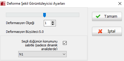 Not: Deforme şekil çizimlerinin ulaşılabilir olması için düğüm noktası davranış parametrelerinin tüm yapısal düğüm noktası çıktılarının istenmiş ve alınmış olması gerekmektedir (bknz. Çıktı modülü). Aksi takdirde, art-işlemci çizimi hazırlamak için yeterli bilgiye sahip olamaz.