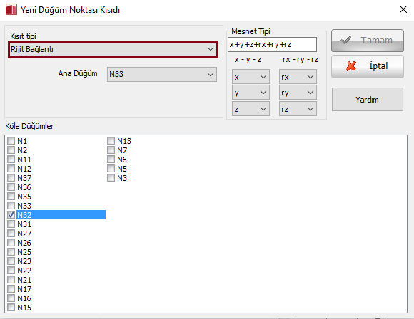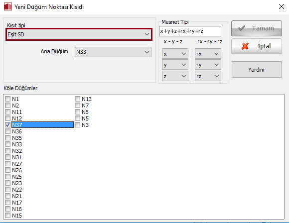 - Sonlu elemanlar programlanmasına göre, sadece iki düğüm noktasının birbirine bağlı olduğu durumlarda ana ve köle düğüm noktaları birbirinin aynısıdır, aralarında bağlantı olan iki düğüm noktasıdır. Bu konuda daha detaylı bilgi için literatüre başvurunuz [ör: Cook et al., 1989; Felippa, 2004].