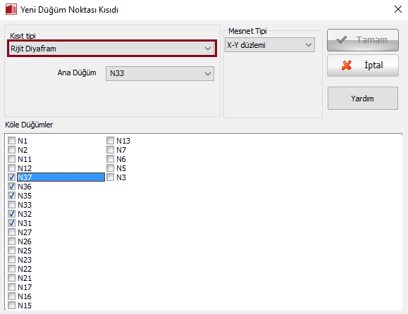 - Diyafram bağlantı genellikle kat başına rijit döşeme durumu olarak kullanılır ve ana nodu genellikle diyafram kütle merkezinde bulunur. Sihirbazla oluşturulan 3D modellerdeki ana düğüm noktası sadece gösterimsel amaçlıdır ve doğru olması gerekmemektedir.