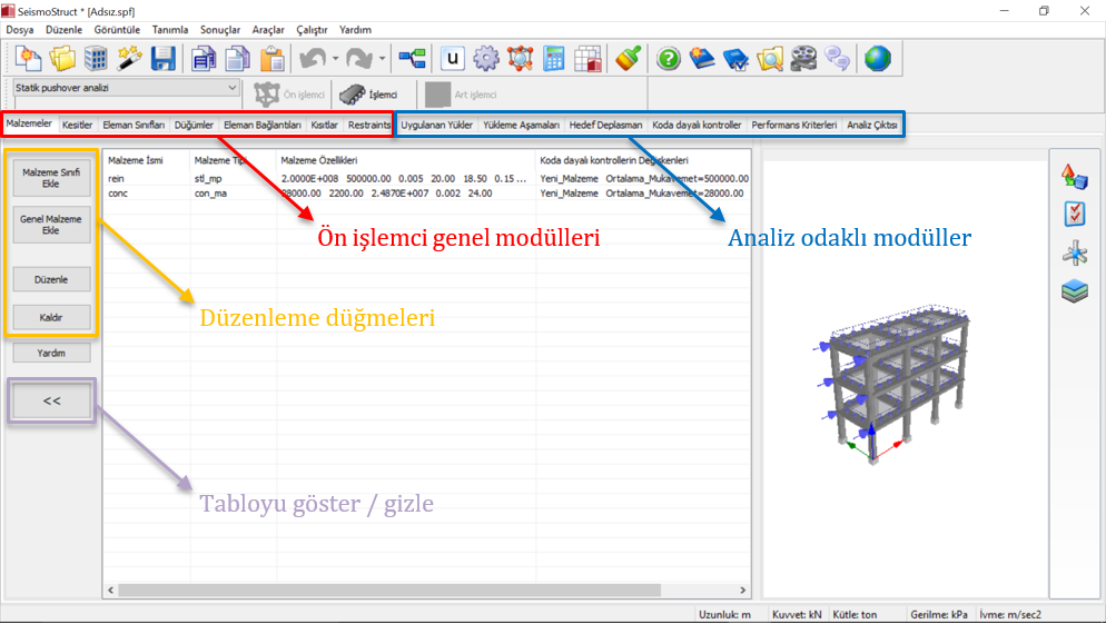 Bahsi geçen her modülde; üç boyutlu modeli 'tüm ekran'da görüntüleyebilmek için, data giriş tablosunu ilintili butonu yoluyla saklamak mümkündür (aşağıda gösterilmektedir).
